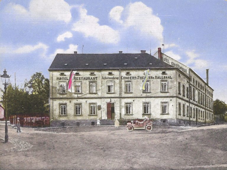 Das Hotel und Restaurant Schützenhaus im Jahr 1917. Nach der Eigenwerbung das größte Etablissement am Platze.